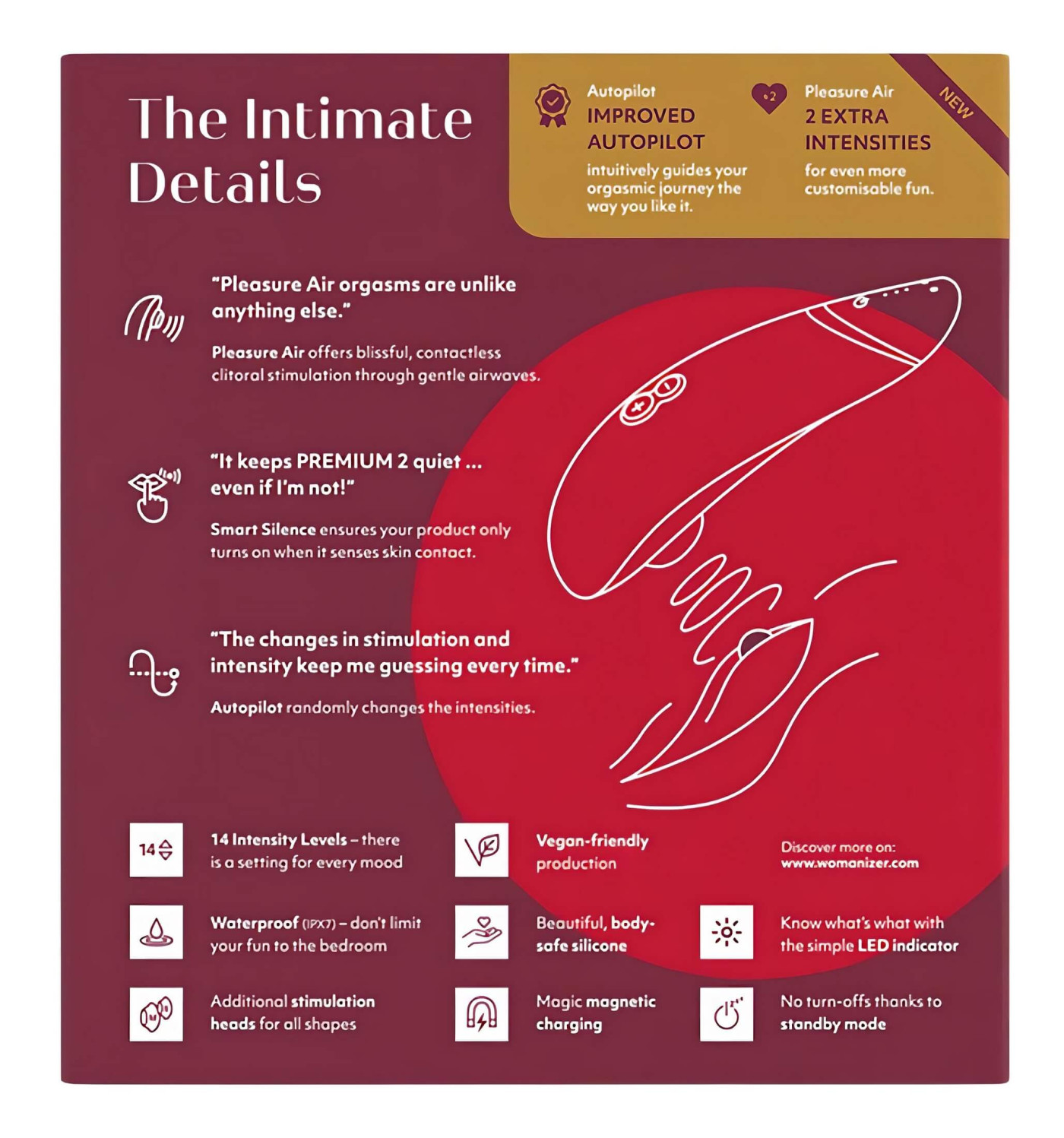 Proč je Womanizer Premium 2 mezi ženami tak oblíbený? 14 úrovní intenzity - od jemné až po extra silnou stimulaciSmart Silence - přístroj se zapne až při kontaktu s tělemAutopilot mód - nečekané změny intenzity a jedinečné orgasmy100% voděodolný - použití ve sprše i ve vaněŠetrnější k přírodě - o 41 % méně plastůSametově hebký povrch - luxusní pocit při dotekuElegantní a ergonomický tvar - sedne přesně na ženské těloPrémiové balení - ideální i jako dárekDárkové doplňky - 2 vyměnitelné stimulační hlavice a bavlněný sáčekCo najdeš v balíčku? 1× Womanizer Premium 2 stimulátor klitorisu 1× magnetický USB nabíjecí kabel 2× náhradní hlavice (10 mm a 14 mm) 1× bavlněný sáček na uložení Vychytávky a specifikace Technologie: patentovaná stimulace pulzními vlnamiÚrovně intenzity: 14Funkce: Smart Silence, AutopilotMateriál: ABS plast, silikon, PU povrch (EU normy, bez ftalátů)Barva: červenáVelikost: 15,5 × 5 × 3,5 cmHmotnost: 135 gPrůměr hlavic: 10 mm a 14 mmBaterie: vestavěná, dobíjecíNabíjení: magnetický USB kabelDoba nabíjení: cca 120 minutDoba provozu: až 240 minutVoděodolnost: IPX7Ovládání: 4 tlačítka, jednoduché použitíJak ho používáš? Odstraň intimní piercing nebo ozdoby z intimních partií. Zapni přístroj dlouhým stiskem tlačítka Power. Polož stimulační hlavici jemně na klitoris, po rozevření stydkých pysků. Intenzitu ovládáš pomocí tlačítek + a - (14 stupňů). Vypni podržením tlačítka dva vteřiny. Režim Autopilot spustíš extra tlačítkem na boku přístroje. Ovládání Premium 2 ovládáš čtyřmi tlačítky : zapnout, vypnout, nastavení intenzity (+/-) a samostatné tlačítko pro Autopilot.